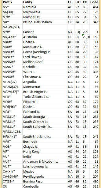 Current Entities This is a list of all 340 Current DXCC entities on the ARRL DXCC Entities List. The ARRL DXCC List publication is available from the ARRL Publication Department for $5.95 plus shipping. To order this publication please visit the ARRL Store. The ARRL DXCC List is also available from our Publication Sales Department for $5.95 each plus shipping. In addition to the List, the paper copy includes: the DXCC rules, DXCC Award Application, ARRL DXCC Card Checkers, Incoming and Outgoing QSL Bureau information and more. Effective April 2, 2012 DXCC card checkers can check all current and deleted entities on the DXCC list. Also, only approved DXCC card checkers can check 160 Meters. For the list of approved 160 Meter card checkers (noted in Red) visit: http://www.arrl.org/dxcc-card-checker-master-list Notes: * Indicates current list of entities for which QSLs may be forwarded by the ARRL membership Outgoing QSL Service. # Indicates entities with which US Amateurs may legally handle third-party message traffic. The last change of the Current DXCC List was made in January 2018. Then, because of an amendment in the DXCC List Criteria, the Entity of Kosovo, with Prefix Z6 was added. NOTES: 37 (VP2) DXCC credit for contacts made May 31, 1958, and before, see page 97, June 1958 QST 38 (V6) Includes Yap Islands January 1, 1981, and after. 39 (XT) Only contacts made August 16, 1960, and after, count for this entity. 40 (YB) Only contacts made May 1, 1963, and after, count for this entity. 41 (Z3) Only contacts made September 8, 1991, and after, count for this entity. 42 (ZC4) Only contacts made August 16, 1960, and after, count for this entity. 46 (VP6) Only contacts made November 16, 2001, and after, count for this entity. 54 (Z8) Only contacts made July 14, 2011, or after, count for this entity. 55 (Z6) Only contacts made January 21, 2018, or after, count for this entity.