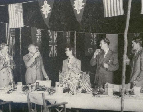 4th of July, Cmdr. and Mrs. Gatti drink a toast with Errol Prince, Weldon King and Norman Wakeford,