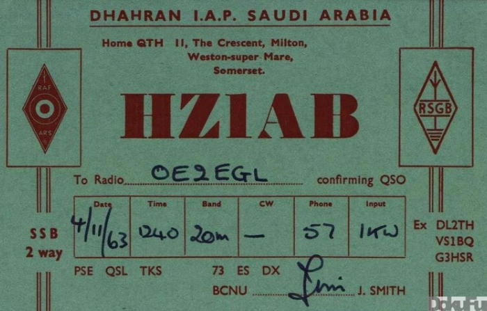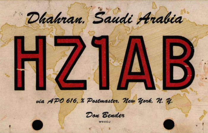HZ1AB - QSL SureHZ1AB was one of the most famous DX calls heard in ham radio. The station was usually responsible for the first worked and confirmed Saudi Arabian contact for the DX enthusiast. In contests, HZ1AB provided country and/or zone multiplier on all bands and modes. HZ1AB provided the first HZ OSCAR satellite Q's for hundreds of OSCAR users. The station went on the air in december 1946; the license was a gift from the Kingdom of Saudi Arabia. Since then, hundreds of thousands of contacts were logged by over 160 different operators.New Station License requirements since 2004 made it necessary to terminate all activity on the bands. The new (Saudi) licensing authority has by mid-2004 re-issued the call HZ1AB The call can still be heard on the bands, but it is not the HZ1AB mentioned in this pages. The call is now activated by Bandar Salah Alharby from Albadyea.HZ1AB LogsThe 160+ oparators who activated HZ1AB made many, many QSOs. Paper logs are managed by K8PYD, Leo Fry. Some Logs (some 106,000 QSOs) are also uploaded to the "Log Book of The World" (LoTW). The uploaded logs include:Almost all contests from WAE SSB August 1991.All QSOs from December 1998, except for some Paper Logs from Dec. 1998 to Dec. 1999.Above you will find many of the QSLs sent out to hams all over the world. Clicking on the QSLs will show the QSL enlarged. Most of these cards are copied from DOKUFUNK.ORG , the QSL museum in Vienna, Austria