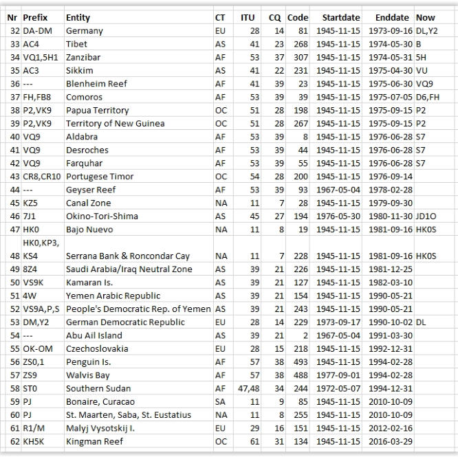 Deleted EntitiesThis is a list of all 62 Deleted DXCC entities on the ARRL DXCC Entities List orderd by the date the Entity was removed from the DXCC Countries List and added to the Deleted List. The ARRL DXCC List publication i(in alfabeticxorder) is available from the ARRL Publication Department for $5.95 plus shipping. To order this publication please visit the ARRL Store. Note: While no longer current, the entities on this list can still be used towards the DXCC awards noted in Section I rule 1 (a-q). Deleted entities do not count towards the Honor Roll, 5 Band DXCC and the DXCC Challenge.Credit for any of these entities can be given if the date of contact in question agrees with the date(s)shown in the corresponding Startdate-Enddate columns.The ARRL DXCC List is also available from our Publication Sales Department for $5.95 each plusshipping. In addition to the List, the paper copy includes: the DXCC rules, DXCC Award Application,ARRL DXCC Card Checkers, Incoming and Outgoing QSL Bureau information and more.Card CheckersEffective April 2, 2012 DXCC card checkers can check all current and deleted entities on the DXCC list.Also, only approved DXCC card checkers can check 160 Meters. For the list of approved 160 Meter cardcheckers (noted in Red) .Use this quick-reference PDF to find an authorized DXCC Card Checker. In addition to DXCC, ARRL DXCC card checkers are authorized to check cards for these other ARRL or IARU awards: WAS (Worked All States) VUCC (VHF/UHF Century Club) WAC (IARU Worked All Continents)