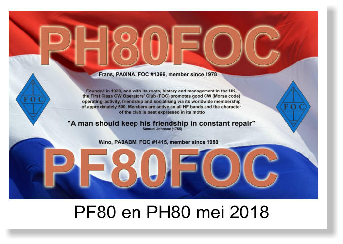 Ik ben ook vaak druk om QSL kaarten, bestemd voor andere calls dan PA0ABM, te beantwoorden. Hier vind je een lijstje van deze activiteitenPA0ABMAls je al meer dan een halve eeuw met de radio hobby bezig bent, en daarbij ook nog fanatiek bent, dan is het logisch dat je veel QSO’s maakt. De teller staat bij mij duidelijk boven de 100.000 QSO’s. Maar hoeveel het er precies zijn valt niet meer te achterhalen.Ik heb als regel dat ik elk QSO met een station waar ik nog nooit op de gewerkte band en/of mode een verbinding mee heb gemaakt, een QSL stuur.In de afgelopen periode heb ik ook verschillende calls gehad. Als je een QSL wilt hebben van een van die calls, dan moet je mij dit maar laten weten. Ik krijg niet van iedereen een QSL kaart terug.Ook heb ik wat speciale calls in de lucht gebracht, en ben ik een paar keer in het buitenland geweest en heb daar uitgezonden. Alle calls waarvan ik QSL-manager ben, vind je hieronder.QSL manager-callsHB0/PA0ABM. In 2007 was de Flying Dutch DX Club, bestaande uit PA0ABM (Wino), PD2R (Maarten), PD1DX (Johan), PA1SWM (Sven) en PD7RB (Robert) een weekje op DXpeditie in Triesenberg Liechtenstein. Het QTH was boerderij Barsula, 1200 meter hoog (400 meter boven Triesenberg). Als gastoperator was PA0INA aan de groep toegevoegd. Ook de XYLs van PD2R, PD2DX en PD7RB waren van de partij. Er werden ongeveer 3700 QSO’s gemaakt in CW, SSB en RTTY.OV2T, Saeby, Denemarken, EU-171. TDit is de prive call van maarten, PD2R. In 2012 vroeg hij mij of ik mee wou gaan naar Saby. Zijn groep (toen PD2R, PD1DX, PA1SVM) had dringend behoefte aan een CW operator. Ik zei ja, en van 2012 t/m 2014 was ik er steeds bij daar in het noorden van Denemarken. In 2015 werd mijn plaats overgenomen door PA7JWC, Jan-Willem.OU2DX, Saeby, Denemarken, EU-171. In 2015 kreeg Johan PD2DX deze call. Ook ik was, tijdens de trips naar Saeby, QRV onder deze call. Het was leuk deze call af te wisselen met die van Maarten, OV2T.PC200ZVL, 200 jaar Zeeuws-Vlaanderen. QRV juli 2014. Er werden ongeveer 4000 QSO’s gemaakt in CW en SSB, door de Zeeuws-Vlaamse leden van PI4DX, (De QSL-kaarten werden gesponsord door firma Stockcorner (Ham Radio Supplies).PA33KBX, 33 jaar Beatrix, 2013. Het feit dat koningin Beatrix zou aftreden na 33 jaar koningin van Nederland te zijn geweest. Alle leden van de PI4DX club waren gedurende 1 maand QRV onder deze call actief. PD1R, PA3EVY en PA0ABM deden het meeste werk, de andere leden waren niet zo actief.PA0ABM/P, IOTA contest EU-146. In de afgelopen jaren is onder mijn call, regelmatig meegedaan met de IOTA contest. In het begin was dat vanaf de Oosterschelde-kering, bij Neeltje Jans, en later vanaf de Schelphoek op Schouwen Duiveland en bij de haven van Burgsluis. Gebruikte calls waren PA0ABM/P en later PA0ABM. In 2012 was de groep een stuk groter, en waren ook PA2A, PA7JWC en PH9B van de partij. Toen werd PA2A als call gebruikt. PA2A (Steef) was ook de QSL manager.PA530ROT, Parijs Rotterdam. Een idee van Erik, PD7M. Hij vond het leuk om voorafgaande aan de 530 km Non Stop wandeling van Parijs naar Rotterdam (530 kilometer) (door de leden van Walk For Sophia) een speciale call te activeren. Het werd PA530ROT. Erik heeft zelf nooit deze call in de lucht gebracht. De call werd voor het eerst in 2014 gebruikt door PA0ABM. In 2016 en 2017 was PA0RRS (Richard) met deze call in RTTY actief.PF80FOC en PH80FOC. In 2018 is het tachtig jaar geleden dat de F.O.C. de First Class CW Operators Club het leven zag. Dit naar het voorbeeld van de Amerikaanse A1 Operators Club. Het idee kwam van R.B. Webster, Bob-G5BW. Deze actieve club van CW enthousiastelingen, waarvan ik al lid ben sinds 1980 heeft de maand mei gekozen om hun 80 jarig bestaan aan de hele wereld kenbaar te maken. Uit verschillende landen zijn clubleden dan actief met speciale 80-roepletters. Mijn roepletters zijn dan PF80FOC, terwijl mijn zwager Frans, PA0INA actief is als PH80FOC. Via het OQRS systeem van www.clublog.org kan een QSL kaart snel aangevraagd worden. De drukken van de QSL kaart is UX5UO, www.ux5uoqsl.comNog wat calls.In het verleden ben ik ook in de lucht geweest als PI1RRS, als PA6FOC en als OE7/PA0ABM. Met de laatste call heb ik tot nu toe slechts 3 QSO’s gemaakt. De gebruikte apparatuur was die van PA0INA.DX is !!, Wino PA0ABM.A man should keep his friendship in constand repair (Samuel Johnson (1755).