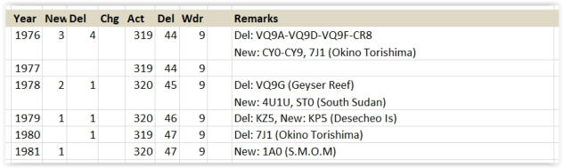 Veranderingen van 1977 t/m 1981 Entiteiten januari 1977: Actief 319, Verwijderd 44, Afgevoerd 9 1977 was een rustig jaar voor het DXCC. Er vonden geen mutaties plaats. Entiteiten januari 1978: Actief 319, Verwijderd 44, Afgevoerd 9 Geyser Reef deleted (QST januari 1978, pagina 78) A deletion to the ARRL DXCC list is Geyser Reef, deleted as of March 1, 1978, by reason of Rule 4 of the Countries List Criteria (unadministered area). ‘This action brings the grand total on the ARRL DXCC list to 363; 318 current and 45 deleted’ Met deze opmerking in QST is duidelijk dat de DXCC Countries List en Deleted List totalen dezelfde zijn als die vernoemd zijn op deze pagina. Op 1 maart verdween Geyser Reef (VQ9/G) naar de Deleted lijst. Madagaskar kondigde, na het vermoeden dat er olie op Geyser Reef was te vinden, de annexatie van het rif aan in 1978. Maar dat lieten de Fransen niet toe, het gebied werd gecontroleerd door de Franse Marine. En Geyser Reef hoorde volgens de Fransen bij de Glorioso Eilanden (FR7/G) . En die eilanden hoorden weer bij Reunion dat ook van Frankrijk is. Als Geyser Reef altijd een Frans grondgebied is geweest, waarom telt Geyser Reef dan toch als een aparte Entiteit van 4 november 1967 tot en met 28 februari 1978? Zouden Geyser Reef QSO’s, gemaakt in deze periode dan tellen voor een credit voor Glorioso? Al de tijd vanaf 15 november 1945? (DX is !!) Rio de Oro deleted (QST juli 1978, pagina 58) A deletion to the ARRL DXCC list is Rio de Oro, deleted as of August 1, 1978. Spain relinquished control of this area, which was absorbed by Morocco (CN) and Mauritania (5T). Deze aankondiging is ook weer een vreemde. Je vind deze Deleted Entiteit namelijk NIET terug in de Deleted List. Waarom niet? Het antwoord hierop is te vinden in de actuele DXCC list. Daar kom je de Entiteit Western Sahara (S0) tegen. Als je nu Note 1 en Note 27 leest dan is duidelijk de RIO de Oro QSO’s nu tellen als verbindingen gemaakt met Western Sahara. Conclusie: Rio de Oro kreeg een andere naam in de DXCC list. Het bericht in QST is dus wel erg misleidend. Snapt U het nog? (DX is !!) United Nations and Southern Sudan added to DXCC list (QST oktober 1978, pagina 64) Two new countries to be added to the ARRL Countries List. 4U1UN, United Nations Headquarters, New York. QSOs made on or after February 4, 1978, count for this country. ST0, Southern Sudan, QSOs made on or after May 7, 1972, count for this country. Op zoek naar DXCC gebouwen De DXCC-Entiteit zoekers concludeerden dat, als het ITU gebouw van Geneva (4U1G) een Entiteit was, dit ook moest gelden voor het gebouw van de Verenigde Naties in New York. Dus kwam U.N. Complex New York (4U1U) op de DXCC lijst te staan. QSO’s met United Nations-HQ (4U1U) zijn dus volgens QST geldig vanaf 2 april 1978 voor het DXCC De Verenigde Naties heeft haar hoofdkwartier in New York City in een complex dat ontworpen is door een groep architecten. De bouw erd voltooid in 1951, en is sindsdien U.N. H.Q. Ik kan er maar niet achter komen waarom 4U1UN QSO’s pas geldig zijn vanaf 4 februari 1978. Gelukkig is deze datum NIET terug te vinden in de DXCC lijst. QSO’s tellen daarom vanaf 15 november 1945, ook al stond het gebouw er toen nog niet. (DX is !!) South Sudan (ST0) De eerste Soedanese burgeroorlog (Anyanya Rebellion) vond plaats van 1955 tot 1972 tussen het noordelijk deel van Soedan Zuid Soedan, dat meer autonomie eiste. Dit leidde in 1972 tot de staat South Sudan. De oorlog telde meer dan een half miljoen doden. De buitenlandse politiek van Zuid Soedan was er een van toenadering tot het Westen en in het bijzonder tot de Verenigde Staten van Amerika. QSO’s met South Sudan (ST0) tellen vanaf 7 mei 1972 voor het DXCC Entiteiten januari 1979: Actief 320, Verwijderd 45, Afgevoerd 9 The addition of Desecheo to the DXCC list ( QST augustus 1979, pagina 82) Upon recommendation of the DXAC, the island of Desecheo is hereby accepted for country status. This action precedes the changes in the DXCC rules concerning separate administrations and entities. All contacts with Desecheo made after March 1, 1979, will be credited beginning September 1, 1978. Ha, weer een Rotspuntje erbij Desecheo is een klein onbewoond eiland ten westen van Puerto Rico. Gedurende de tweede wereldoorlog tot 1952 werd het eiland gebruikt door de Amerikaanse luchtmacht (bommen gooien). Van 1952 tot 1964 deed het eiland dienst als oefenterrein (survival training) . In 1976 kwam het eiland onder toezicht van het U.S. Fish and Wildlife Service en in 1983 werd Desecheo een Nationaal Wildpark. Bingo voor de Entiteit-zoekers, dus werd Desecheo Island (KP5) toegevoegd aan de DXCC lijst. QSO’s met Desecheo Island (KP5) tellen vanaf 1 maart 1979 voor het DXCC Wacht even. Dit eiland stond al in 1976 onder controle van de U.S. Fish and Wildlive Service. Waarom is de startdatum voor geldige QSO’s dan niet ergens in 1976? (DX is!!) Canal Zone deleted (QST december 1979, pagina 90) The Canal Zone (KZ), as of October 1, 1979, became a deleted country on the DXCC list. All contacts made before October 1, 1979, will count as the Canal Zone. All contacts made on and after October 1, 1979, will count as Panama (HP). The DXCC list stands at 319 countries current and 47 deleted. In 1979 kwam de Kanaalzone (KZ5) in Panana weer onder beheer van Panam, en kwam daarmee op de Deleted lijst te staan. De Panama-kanaalzone (Canal Zone) was een grondgebied van zo'n 1.432 km² binnen Panama, bestaande uit het Panamakanaal en een aangrenzend stuk land, zo'n 8,1 km breed aan weerszijden van het kanaal. Het gebied grenst aan twee provincies van Panama, en werd in 1903 gecreëerd Het grondgebied was tussen 1903 en 1979 in handen van de Verenigde Staten, daarna tot 1999 gezamenlijk eigendom van de VS en Panama, waarna het uiteindelijk geheel opgenomen werd door Panama. QSO’s met Canal Zone (KZ5) zijn geldig tot 30 september 1979. Entiteiten januari 1980: Actief 320, Verwijderd 46, Afgevoerd 9 Okino Torishima deleted (QST, 