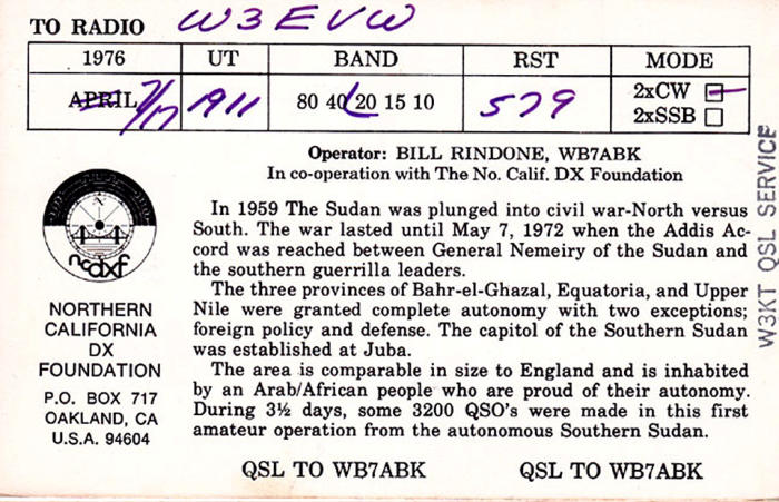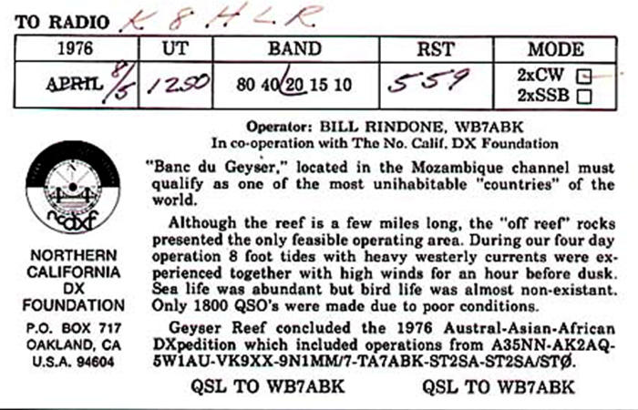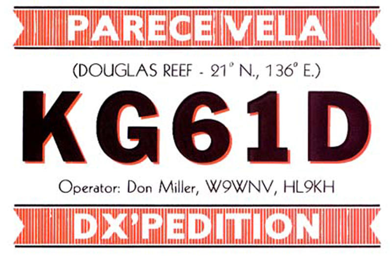 Another activity from Don, W9WNV Strange prefix for Geyser reef YM belongs to Tukey) Strange prefix for Geyser reef YM belongs to Tukey) Map of Rio de Oro (Western Sahara) EA9DE from Rio de Oro (Now Western Sahara) 4U1UN, a building in New York with DXCC rules First ST0 (South Sudan) activity) First ST0 (South Sudan) activity) Desecheo Island, a new Entity in 1979 KZ5 Canal Zone, deleted in 1979 7J1RL, bij vloed ONDER water 1A0KM the official S.M.O.M. station in Roma Fort St. Angelo, Malta with flag of the Order Parece Vela, ofwel Okino Torishima Parece Vela, ofwel Okino Torishima